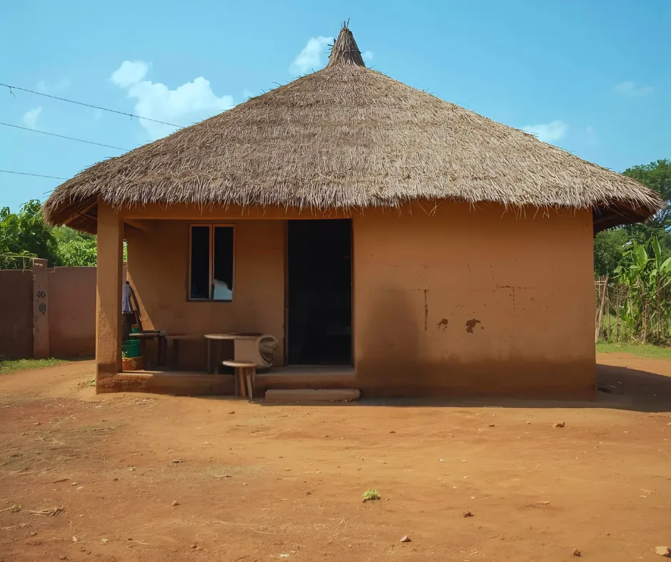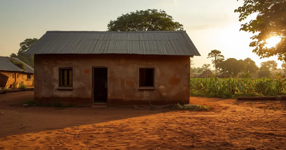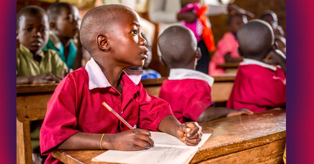A group of rural Ugandan students sit in a modest classroom as their teacher instructs them. The worn desks, simple materials, and sparse surroundings reveal the challenges of limited resources, while the attentive faces of the pupils reflect curiosity, determination, and the transformative power of education.