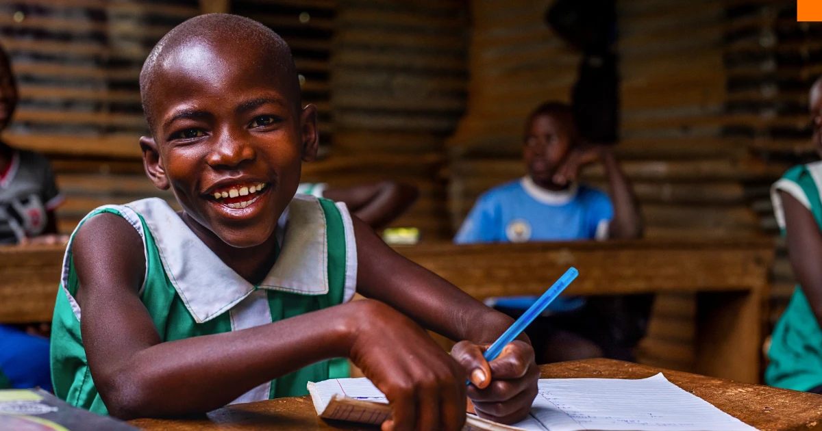 A smiling Ugandan boy proudly holds up his pen in a worn rural classroom, capturing the hope and determination Baino Social Impact fights to build and protect through education and child empowerment.